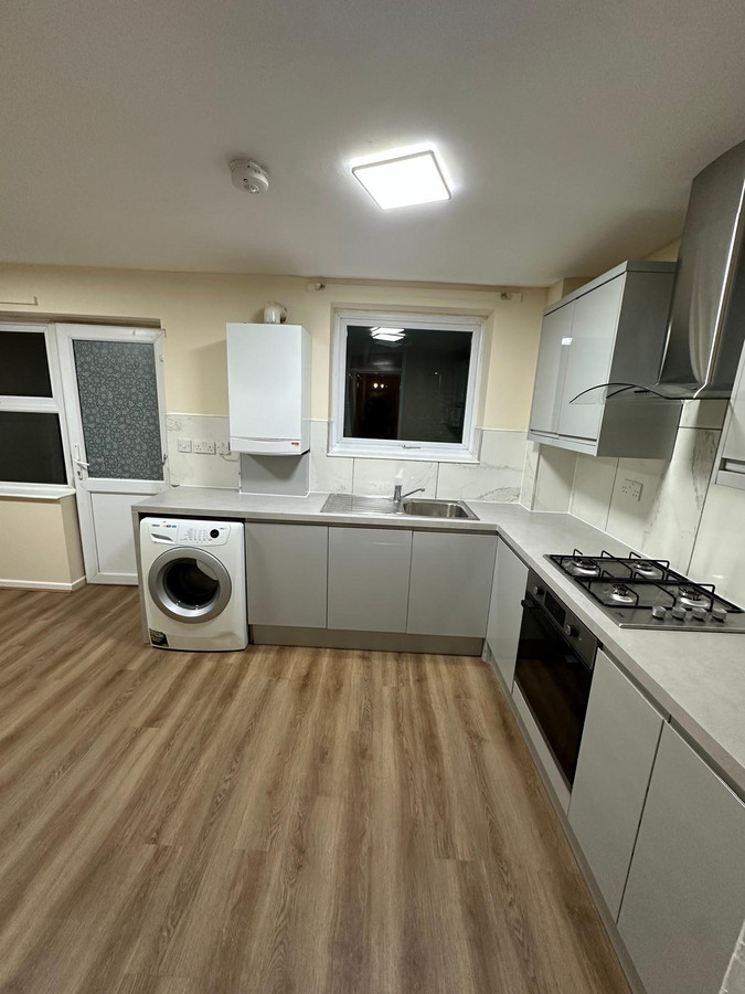 The ground floor opens with a bright entrance hallway leading into a spacious lounge with modern wood-effect flooring and recessed LED lighting, creating a warm and contemporary atmosphere. The adjoining kitchen features sleek grey cabinetry, integrated oven and hob, a stainless-steel extractor hood, and ample worktop space—ideal for family meals and entertaining. The kitchen also includes a washing machine and offers access to the rear garden.