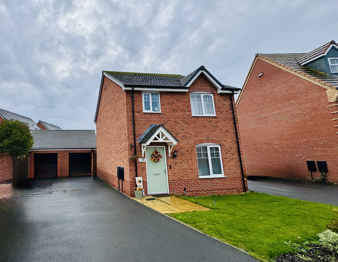The front of the property has a small lawn with a pathway to the side, leading to the front entrance. There is a tarmac driveway leading to the garage and side gated access.